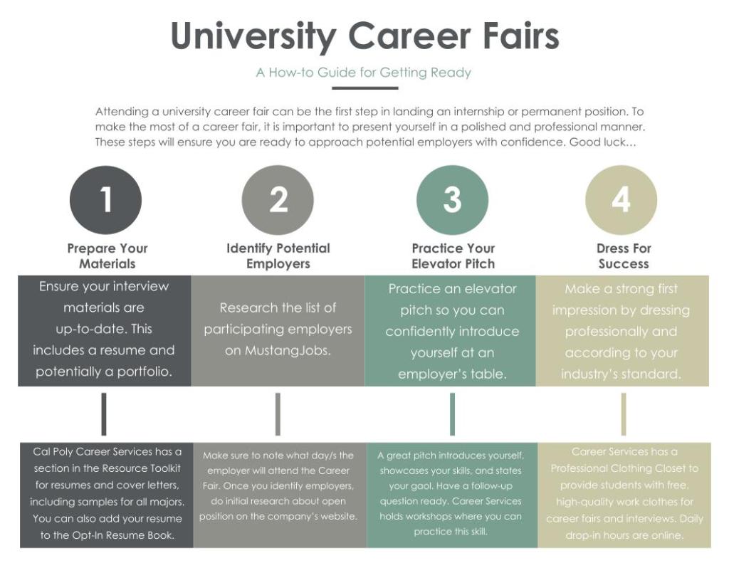 Most students will eventually attend an on-campus or virtual Career Fair. This how-to infographic breaks down the preparation process for a Career Fair into clear and simple steps.