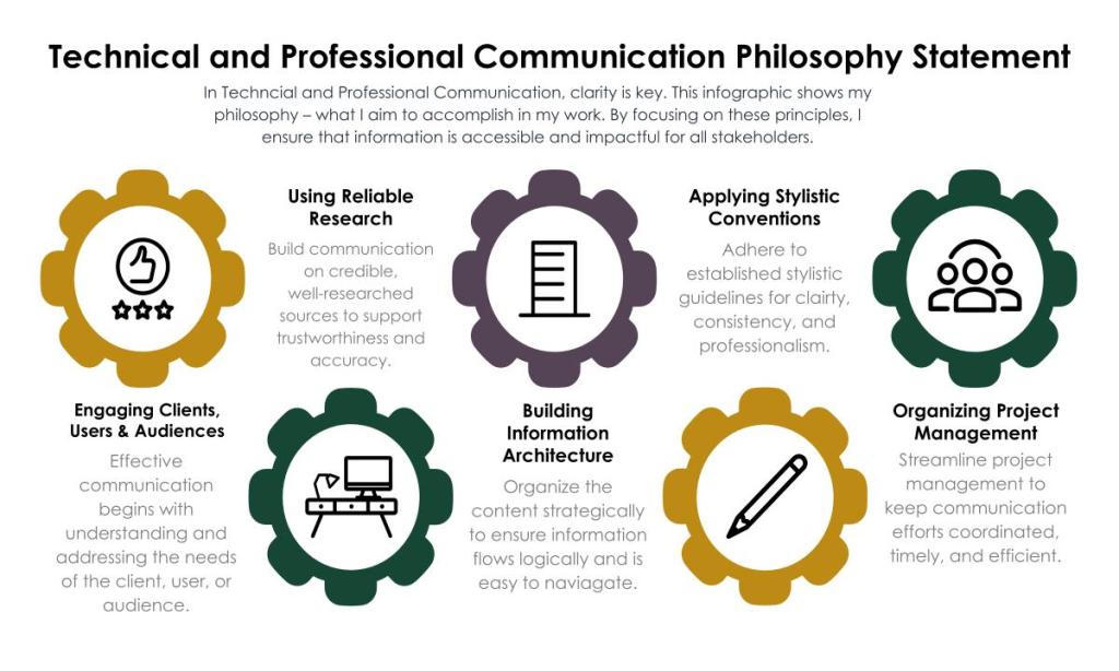 Part of a final project for Intro to Technical Communication, this infographic illustrates my approach to Tech Comm – ensuring information is accessible, effective, and impactful for all stakeholders.